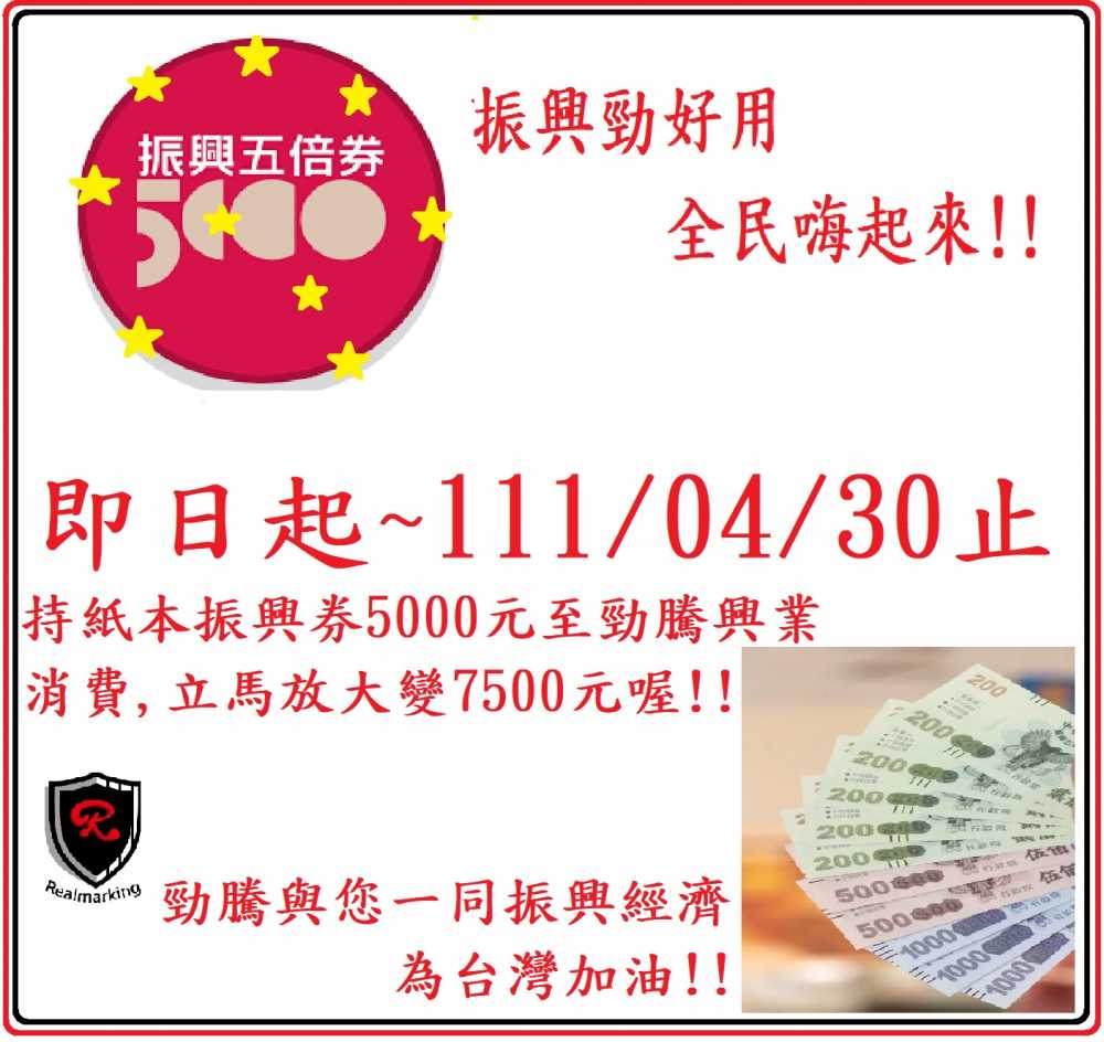 單一客戶限使用一次振興五倍卷,使用五倍卷需為$5,000整數金額,可向勁騰興業單次兌換價值NT$7,500商品,如果商品價格超過NT$7,500等可以現金支付差額,兌換期至2022/4/30止。