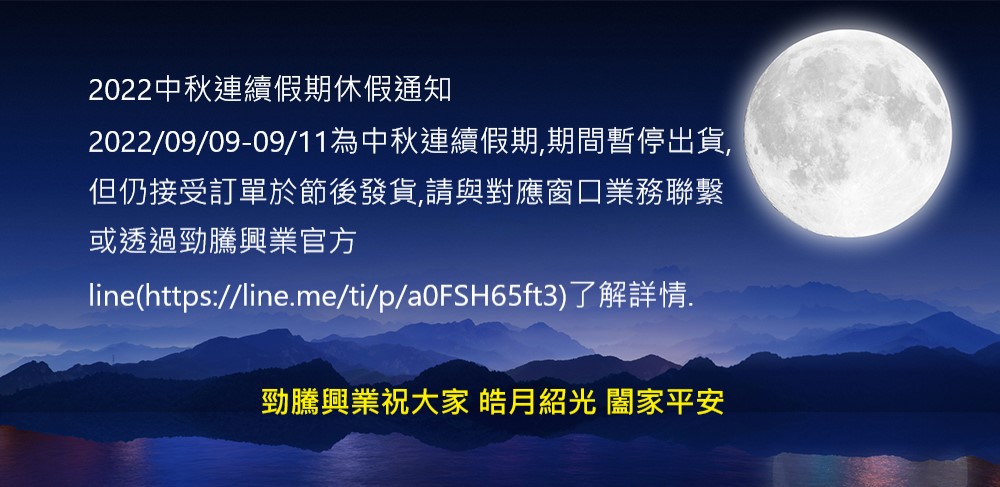 2022/09/09-09/11為中秋連續假期,期間暫停出貨,但仍接受訂單於節後發貨,請與對應窗口業務聯繫或透過勁騰興業官方LINE了解詳情(https://line.me/ti/p/a0FSH65ft3).